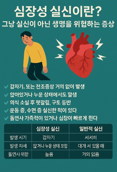 항목심장성 실신일반 실신(신경성, 기립성 등)항목 심장성 실신 일반 실신 (신경성, 기립성 등) 발생 상황 갑작스러움, 경고 없이 발생 더운 날, 오래 서있을 때 예고 증상 거의 없음 어지러움, 식은땀, 구역질 발생 위치 앉아 있거나 누운 상태에서도 발생 대부분 서 있을 때 발생 의식 회복 비교적 느림, 혼란 동반 빠르게 정상 회복 연령 모든 연령 가능, 특히 고위험군·운동선수 젊은 여성, 저혈압 체질 위험도 돌연사 위험 존재 대부분 양성, 예후 좋음 심장성 실신은 전조 증상이 없고 갑작스럽게 ‘뚝’ 끊기듯 발생하며,